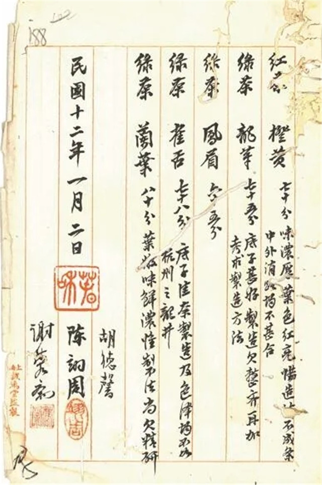 1922年11月,朱文精將實(shí)習(xí)所焙制的5種茶樣交實(shí)業(yè)司,轉(zhuǎn)送上??偵虝诱垖<以u定。擔(dān)任上??偵虝褂[會茶葉審查員的胡德馨、陳翊周、謝蓉齋3位茶業(yè)專家在詳細(xì)查驗(yàn)品評茶樣后,聯(lián)合出具了報(bào)告書。報(bào)告書記載,5份茶樣,合紅茶1份,綠茶4份,分別是橙黃、龍華、鳳眉、雀舌、蘭葉。其中蘭葉“葉嫩味鮮濃”得分最高,獲得80分??傮w來看,專家們認(rèn)為茶業(yè)實(shí)習(xí)所送評的茶葉,無論紅茶還是綠茶,茶葉的底子都好,但制法上尚欠精研,還需提高。