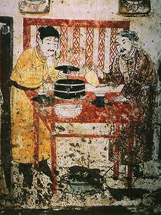 見于河北宣化下八里村6號墓遼代壁畫。壁畫中共有6人,一人碾茶,一人煮水,一人點茶,反映了當時的煮茶情景。