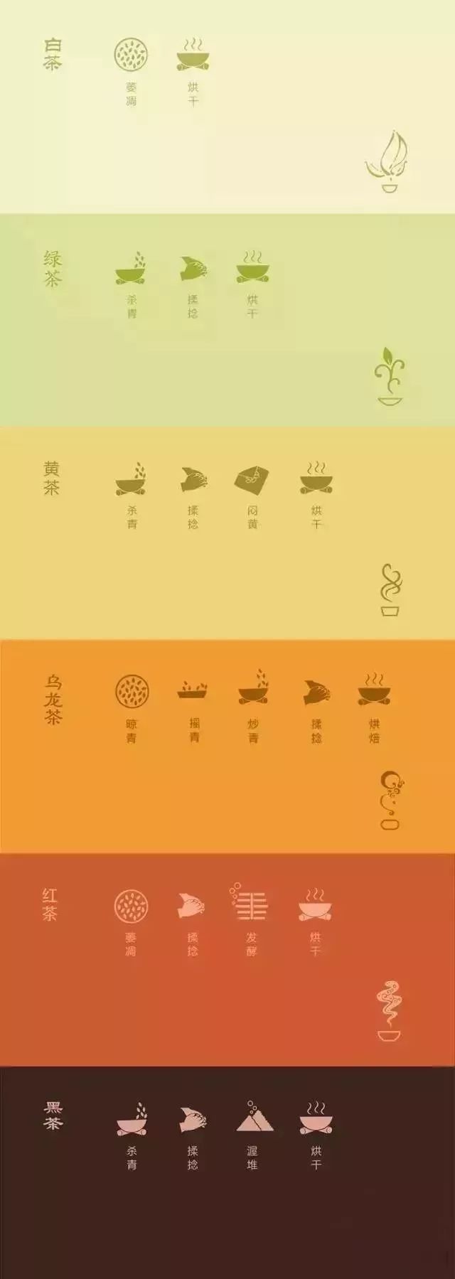上圖是六大茶類的制作工藝,而事實上,六大茶類各有一道關(guān)鍵工序,這道關(guān)鍵工序是正是六大茶類分類的標準來源。