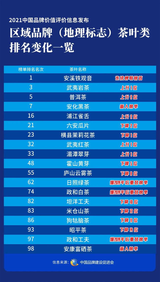 5升8降!2021中國品牌價(jià)值評(píng)價(jià)信息發(fā)布 區(qū)域品牌(地理標(biāo)志)茶葉類排名變化一覽