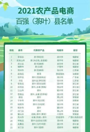 日前,農(nóng)業(yè)農(nóng)村部管理干部學(xué)院、阿里研究院聯(lián)合發(fā)布《農(nóng)產(chǎn)品電商出村進(jìn)城研究:以阿里平臺(tái)為例》報(bào)告和2021農(nóng)產(chǎn)品電商百?gòu)?qiáng)縣名單,其中茶葉類(lèi)縣市22個(gè)入選,廣東省饒平縣是廣東省唯一上榜縣市。